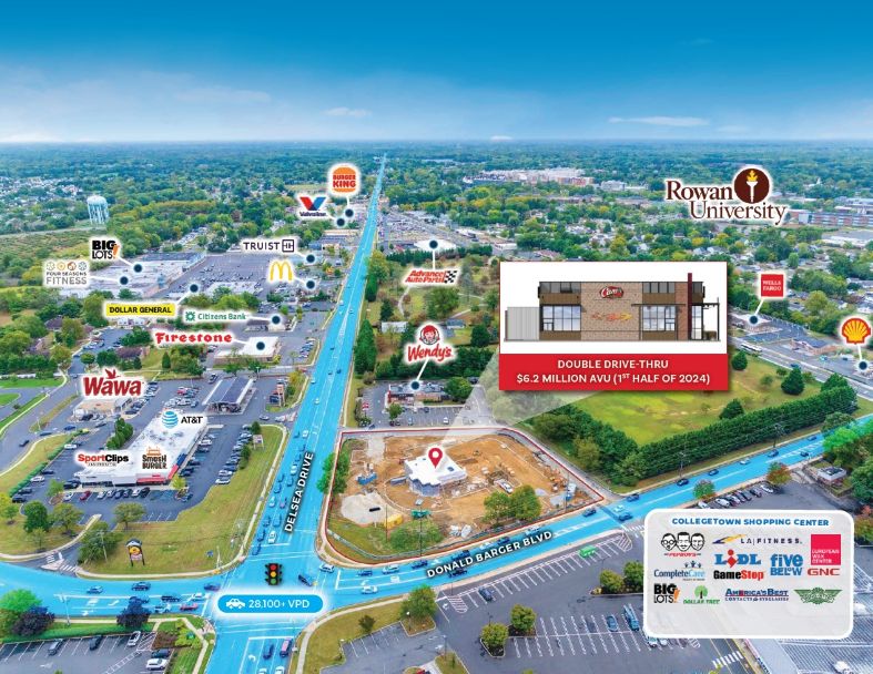 The new construction Raising Cane’s is located at 695 Delsea Drive N in Glassboro, New Jersey and consists of a 3,026 square foot building with a drive thru. Raising Cane’s has a new 15-year Absolute NNN Ground Lease with five (5), five-year renewal options. The lease calls for attractive rent increases every 5 years throughout the primary lease term and at the start of each renewal option. Raising Cane’s is extremely well located along Delsea Drive N (NJ Route 47), the region’s primary retail corridor. Situated at the signalized intersection of Delsea Drive N and Donald Barger Boulevard, the Property enjoys outstanding visibility, frontage and access and is 1-mile from US Route 322, and 2.4-miles from the Jersey Freeway (NJ Route 55). Additionally, Raising Cane’s shares the intersection with Doubletree Shopping Center (ALDI anchored) and College town Shopping Center (Lidl & Esporta anchored), the two largest retail centers in the area. The Property is part of a dominant trade area that is home to countless national retailers and restaurants, Rowan University, Inspira Medical Center Mullica Hill, all of which drive traffic to the area. Additionally, the Property is surrounded by densely populated residential neighborhoods providing a built-in customer base.